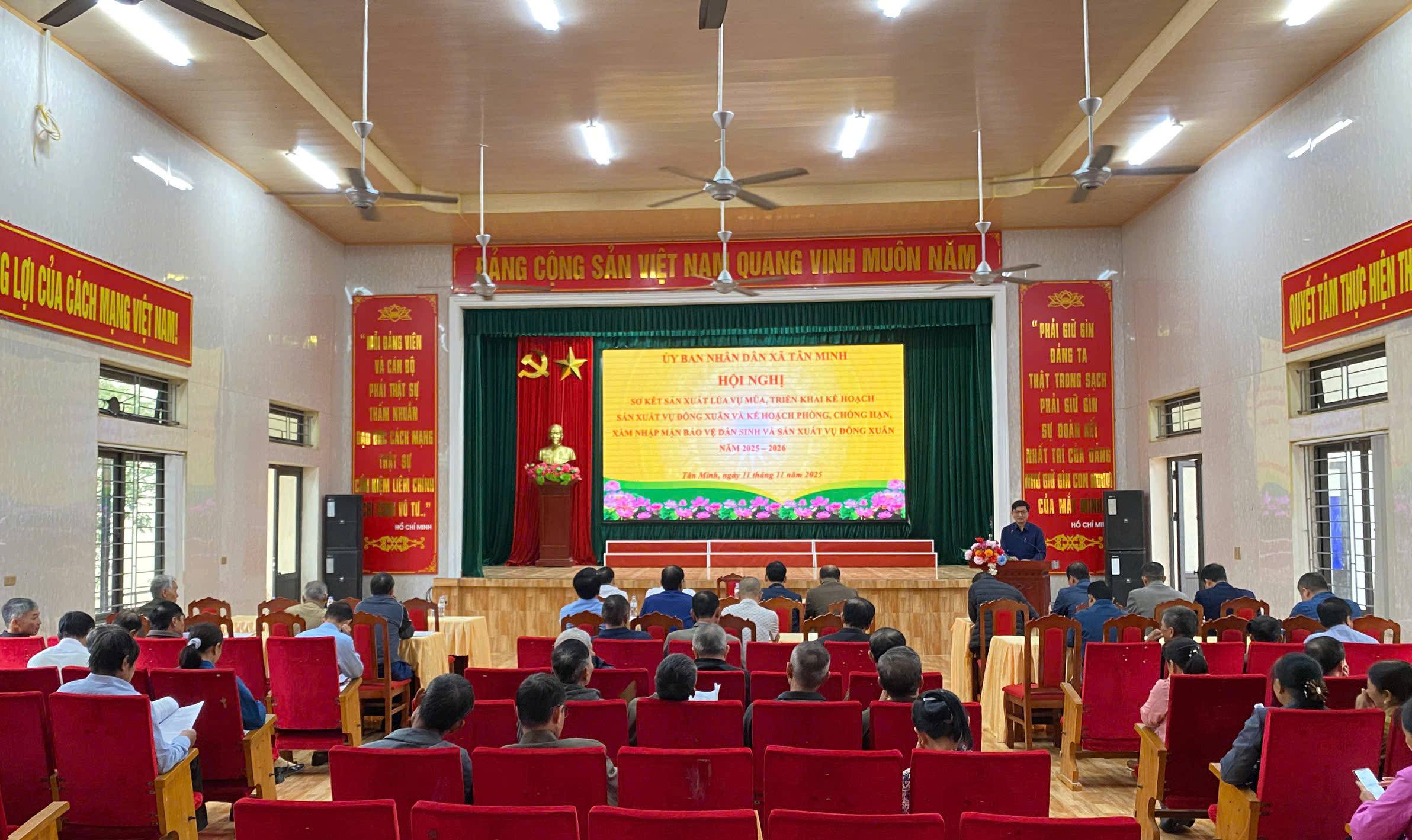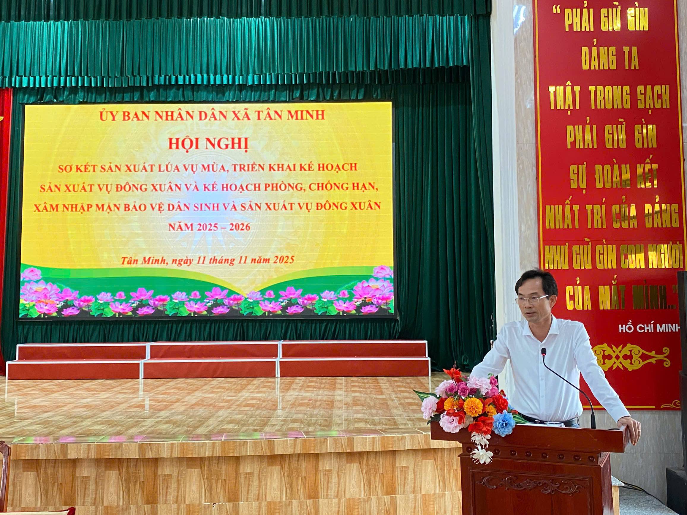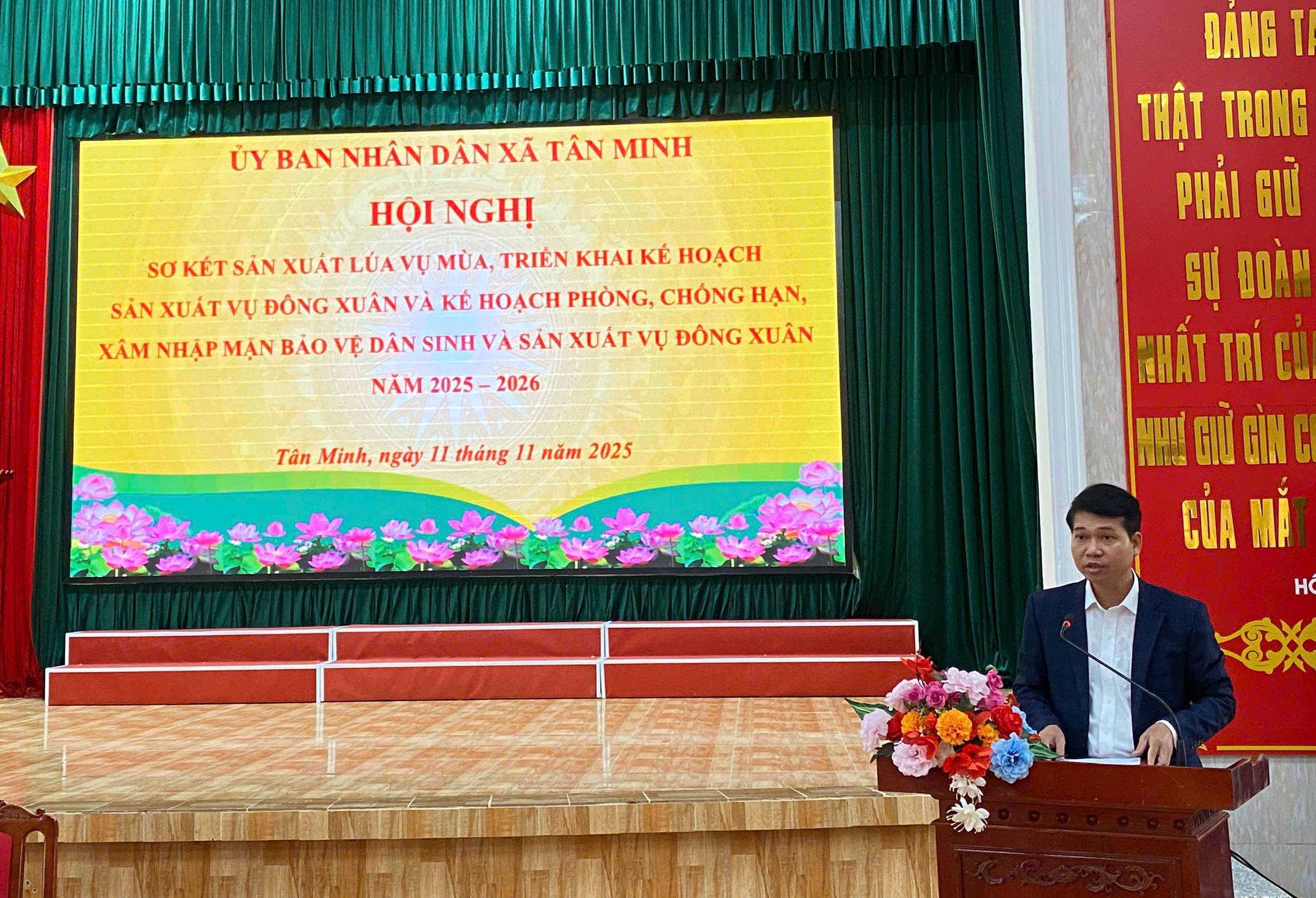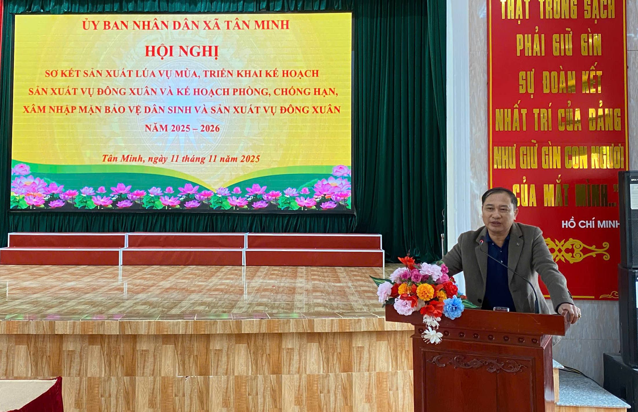 Phát biểu kết luận hội nghị, đồng chí Đinh Văn Nhanh – Chủ tịch UBND xã nhấn mạnh: Sản xuất vụ Mùa năm 2025 của xã Tân Minh đạt kết quả tốt, thể hiện rõ vai trò lãnh đạo, chỉ đạo của cấp ủy, chính quyền, sự chủ động của các cơ quan chuyên môn và sự tích cực, sáng tạo của bà con nông dân. Kết quả này là cơ sở quan trọng để xã tiếp tục thực hiện thắng lợi kế hoạch sản xuất vụ Đông Xuân 2025–2026 và mục tiêu phát triển nông nghiệp bền vững trong thời gian tới. Về nhiệm vụ trọng tâm thời gian tới, đồng chí Chủ tịch UBND xã đề nghị các cơ quan đơn vị, các thôn tuyên truyền vận động nhân dân khẩn trương thu hoạch lúa mùa, tránh thiệt hại do thời tiết bất lợi. Tuyên truyền, vận động nông dân mở rộng diện tích trồng cây vụ Đông có hợp đồng bao tiêu như khoai tây Atlantic, dưa, ớt, cà chua, rau màu khác. Thực hiện cày lật đất, vùi gốc rạ sớm, chuẩn bị đất sản xuất vụ Xuân 2026. Triển khai nghiêm túc các nhiệm vụ theo Kế hoạch của UBND xã về sản xuất vụ Đông Xuân và phòng, chống hạn, xâm nhập mặn.