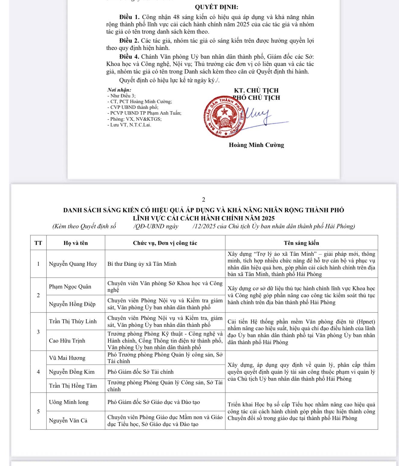 UBND thành phố Hải Phòng đã công nhận 48 sáng kiến có hiệu quả áp dụng và khả năng nhân rộng trên địa bàn thành phố thuộc lĩnh vực cải cách hành chính năm 2025.